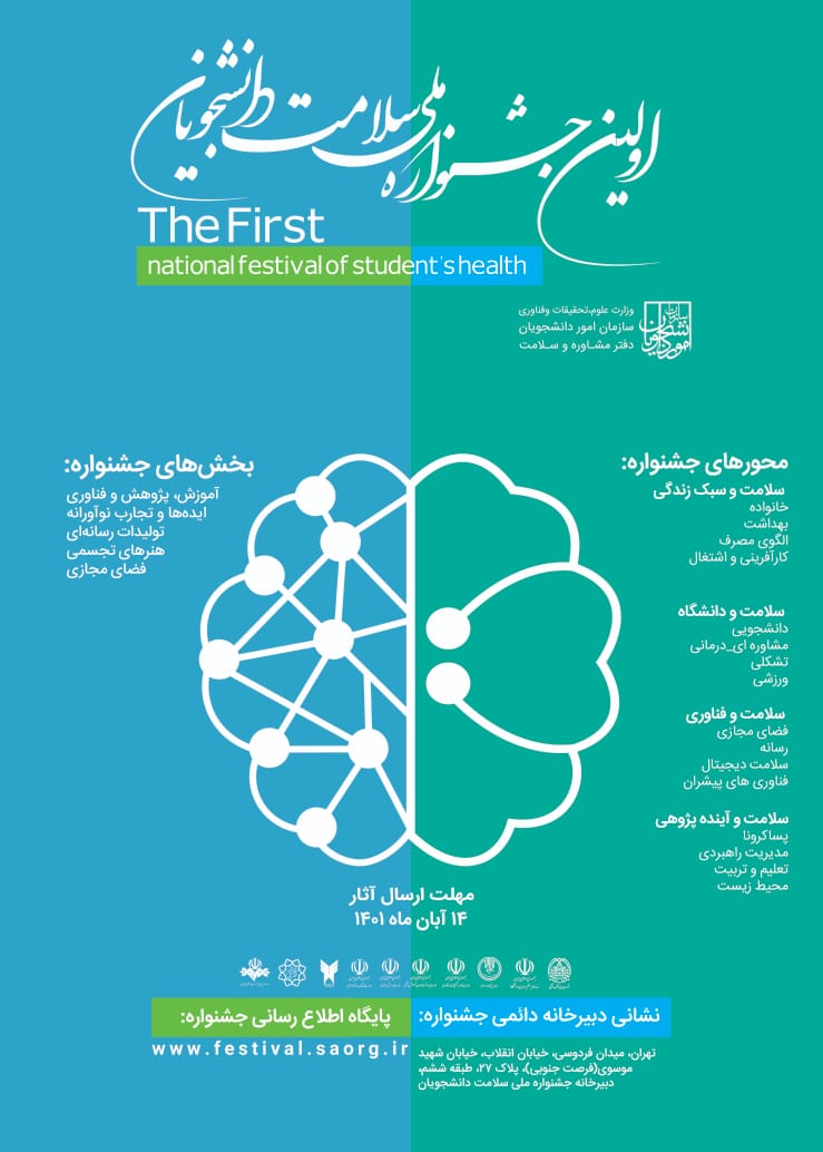 دفتر مشاوره و سلامت سازمان امور دانشجویان در نظر دارد اولین جشنواره ملی سلامت دانشجویان ایران را با مشارکت دانشجویان از تمامی دانشگاه های سراسر کشور برگزار نماید. لذا از کلیه دانشجویان علاقمند به حوزه سلامت دعوت می شود آثار خود را حداکثر تا تاریخ 14 آبان 1401 به دبیرخانه جشنواره ارسال نمایند.