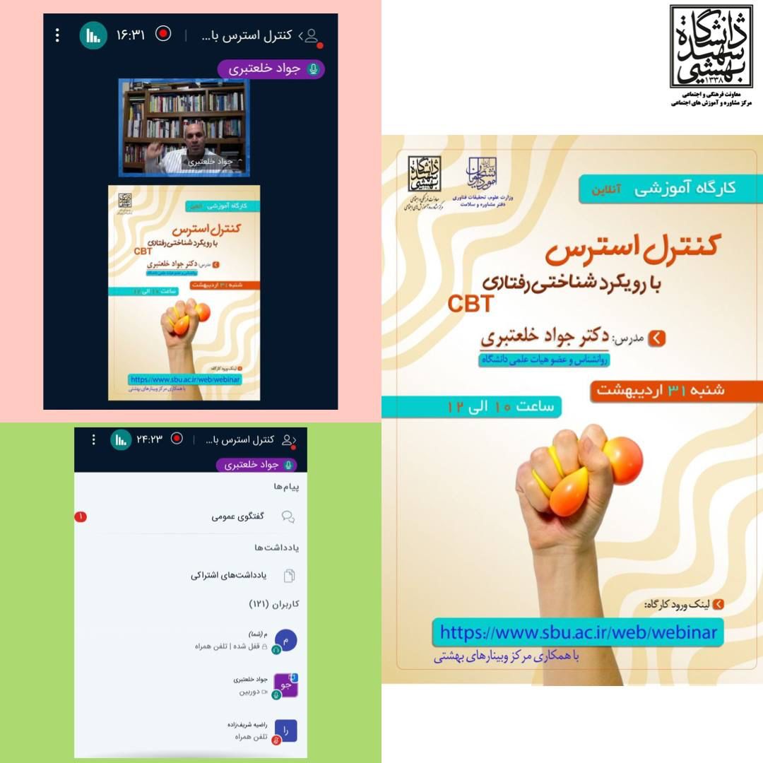 🏢مركز مشاوره و آموزشهاي اجتماعي برگزار كرد👩💻👨💻كارگاه آموزشي انلاين كنترل استرس با رويكرد CBT🧑🏫مدرس: آقاي دكتر جواد خلعتبري ( روانشناس و عضو هيات علمي دانشگاه )لازم به ذكر است اين كارگاه آموزشي ديروز ٣١/٢/١٤٠١ با استقبال پرشور دانشجویان و دانشگاهیان عزيز برگزار شد.