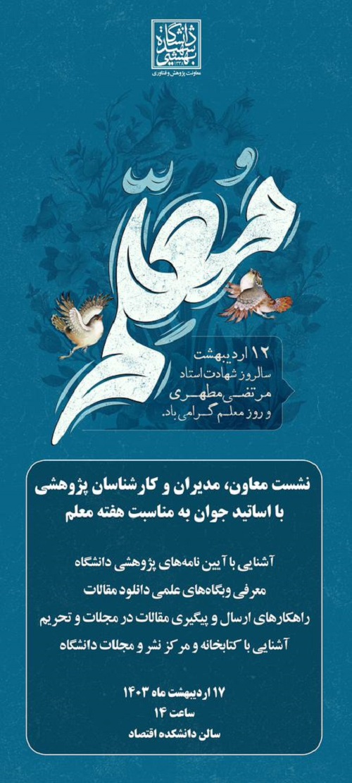 در این نشست که به همت معاونت پژوهشی دانشگاه شهید بهشتی و به مناسبت هفته معلم برگزار می شود مباحثی چون آشنایی با آییننامههای پژوهشی دانشگاه، معرفی وبگاههای علمی دانلود مقالات، راهکارهای ارسال و پیگیری مقالات در مجلات و تحریم و همچنین آشنایی با کتابخانه و مرکز نشر و مجلات دانشگاه بحث و بررسی خواهد شد.